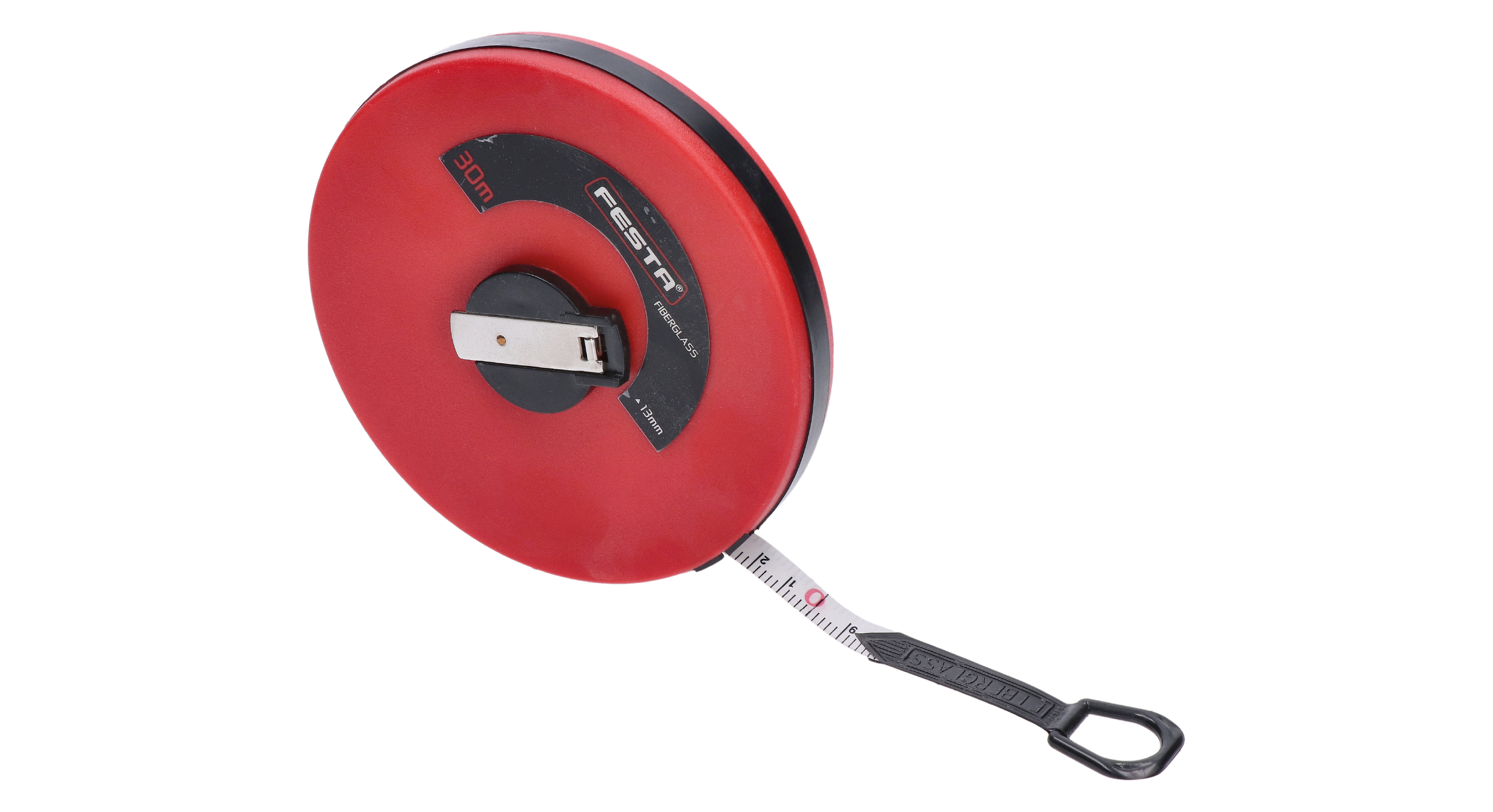 - 30m sklolaminátové meracie pásmo, páska zakončená očkom s gumovou ochranou, sklopná navíjacia rúčka, pútko