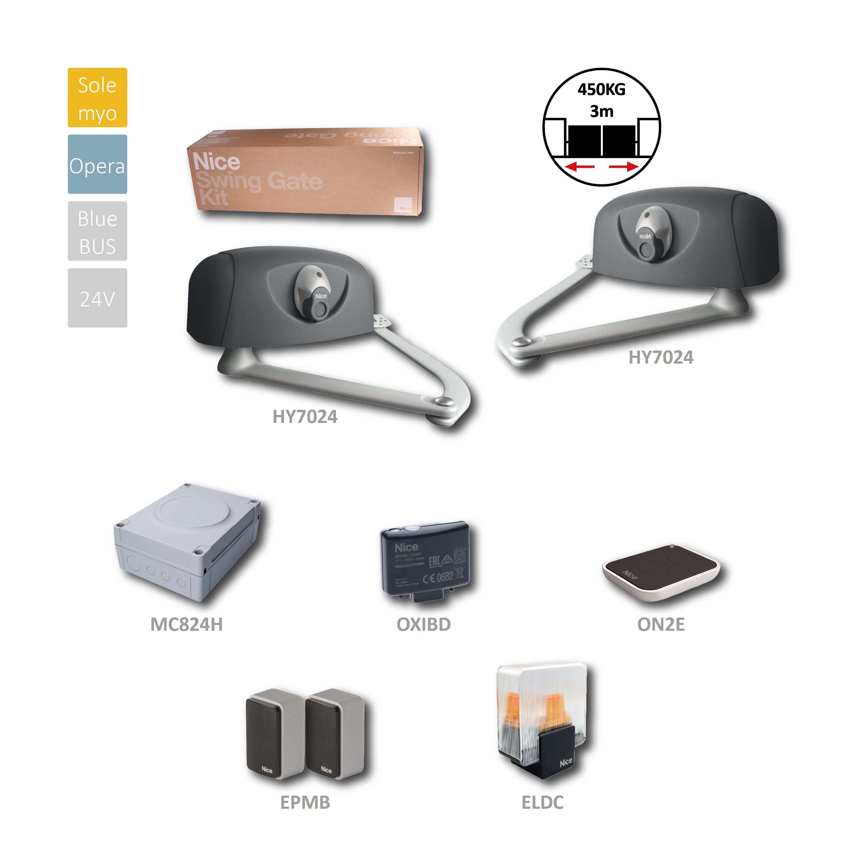 Sada pákových pohonů pro dvoukřídlou bránu do 3m/křídla, 2x HY7024, 1x MC824H, 1x OXIBD, 1pár EPMB, 1x ON2E, 1x ELDC