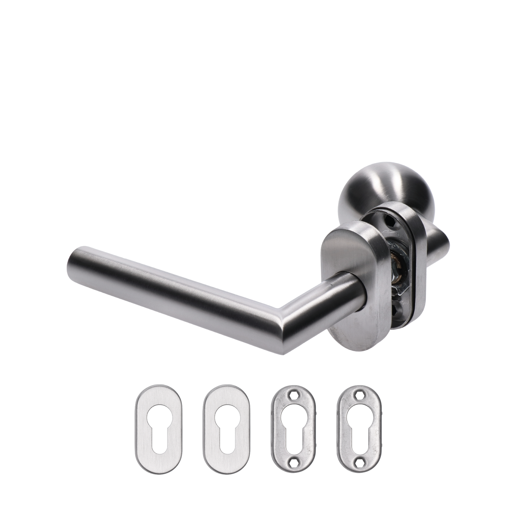 Klika (levá) + koule (otočná), vyhnutá včetně spodní rozety, balení: 1ks klika (levá), 1ks koule, 2ks spodní oválná rozeta, broušená nerez AISI304