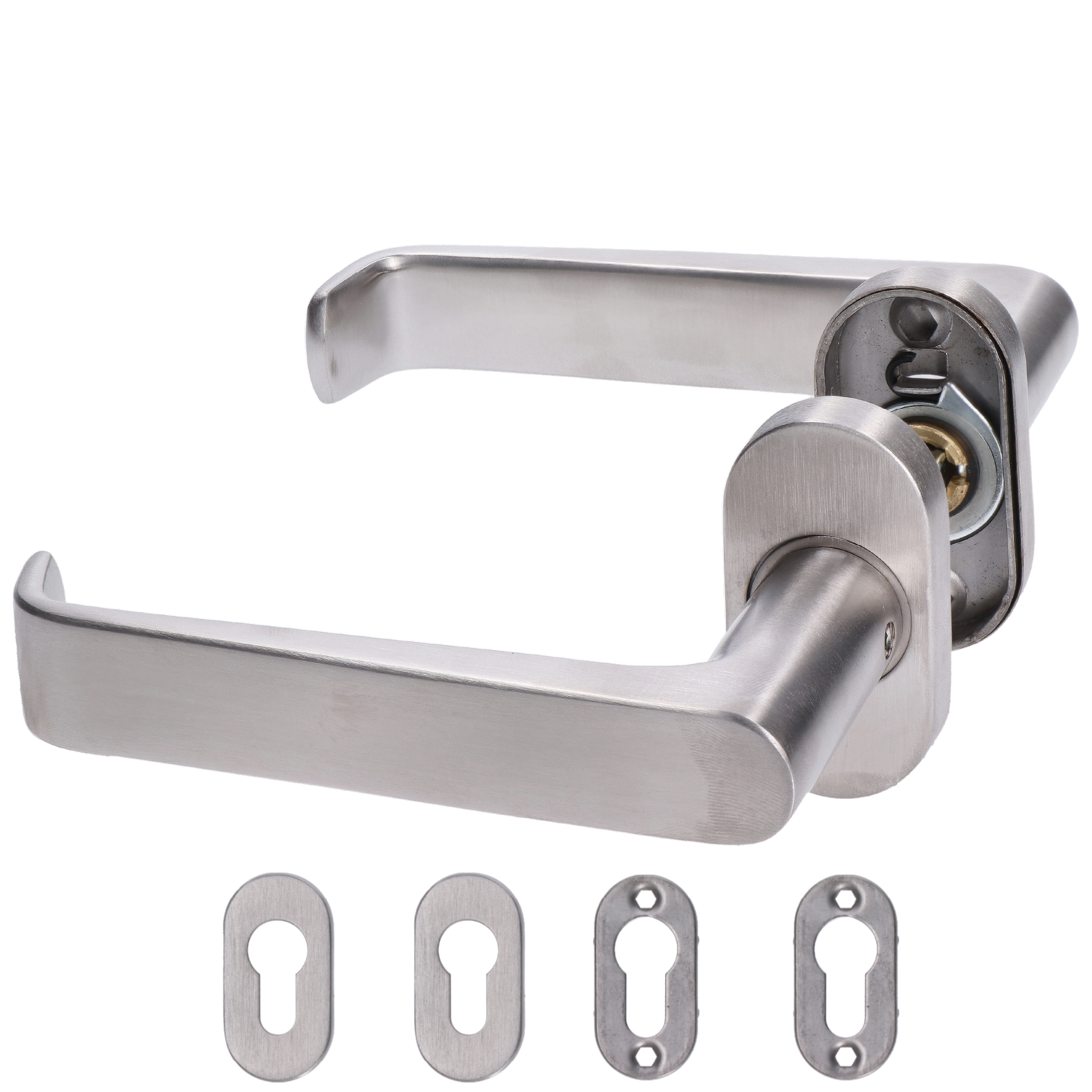 Klika nerezová (pár) včetně dolní rozety, balení: 2ks klika + 2ks dolní rozeta, příslušenství k montáži, broušená nerez K320/AISI304