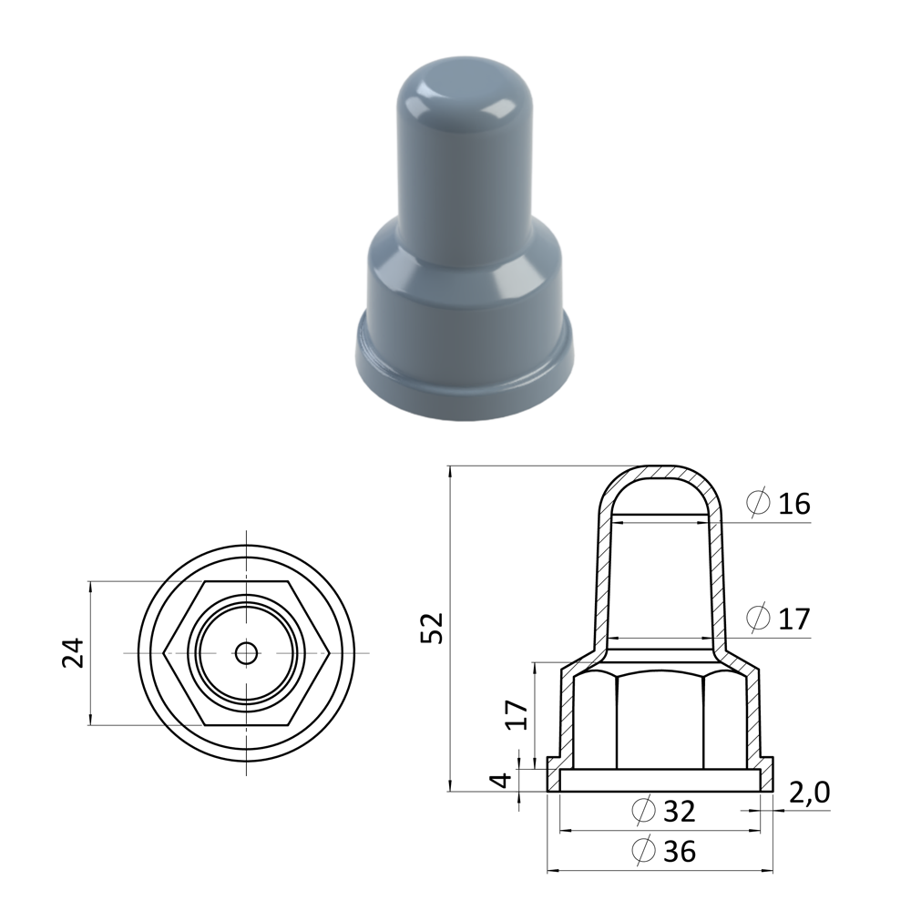 - Krytka plastová na matice a šrouby M16, prodloužená, šedá