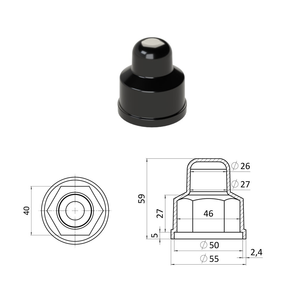 - Krytka plastová na matice a šrouby M27, prodloužená, černá