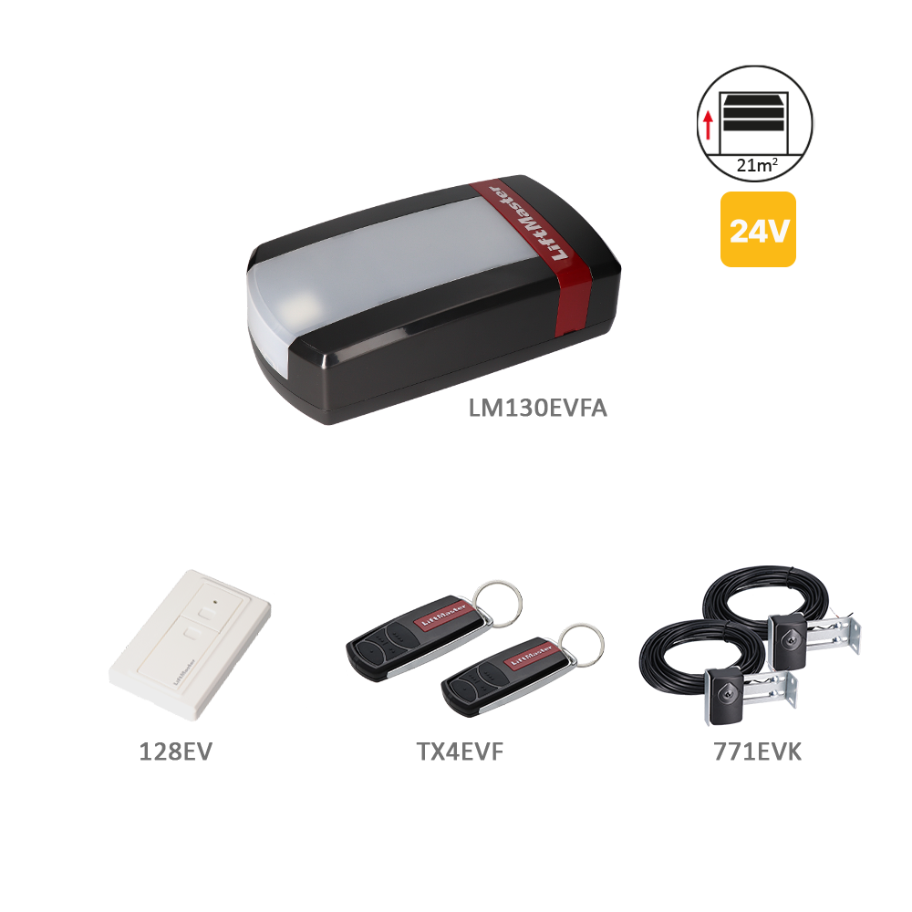 LiftMaster LM130EVFA je tichý, rychlý a spolehlivý pohon pro sekční garážová vrata do hmotnosti 200 kg a rozměrů až 6,0 m (šířka) × 3,5 m (výška). Pohon pracuje na 24 V DC a poskytuje maximální zdvihovou sílu 1300 N. Díky modernímu designu, nízké hlučnosti (<70 dB) a integrovanému LED osvětlení je ideálním řešením pro rodinné domy.