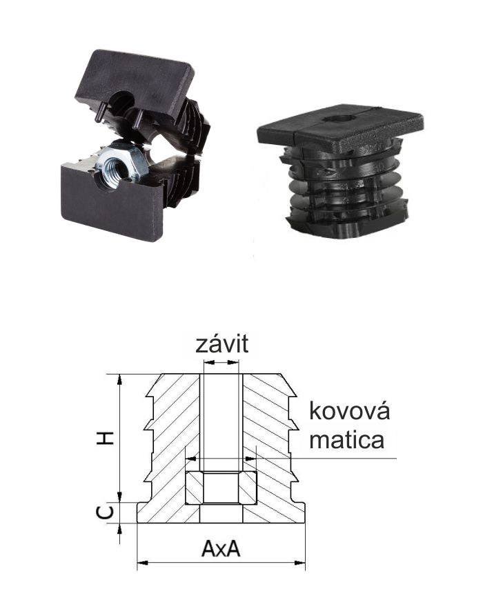 M10,A-30mm,H-30mm,C-5mm,čierna, Hrúbka steny 1.2-2mm, Plastová vystužená štvorcovo-rúrková zátka s kovovou maticou PE