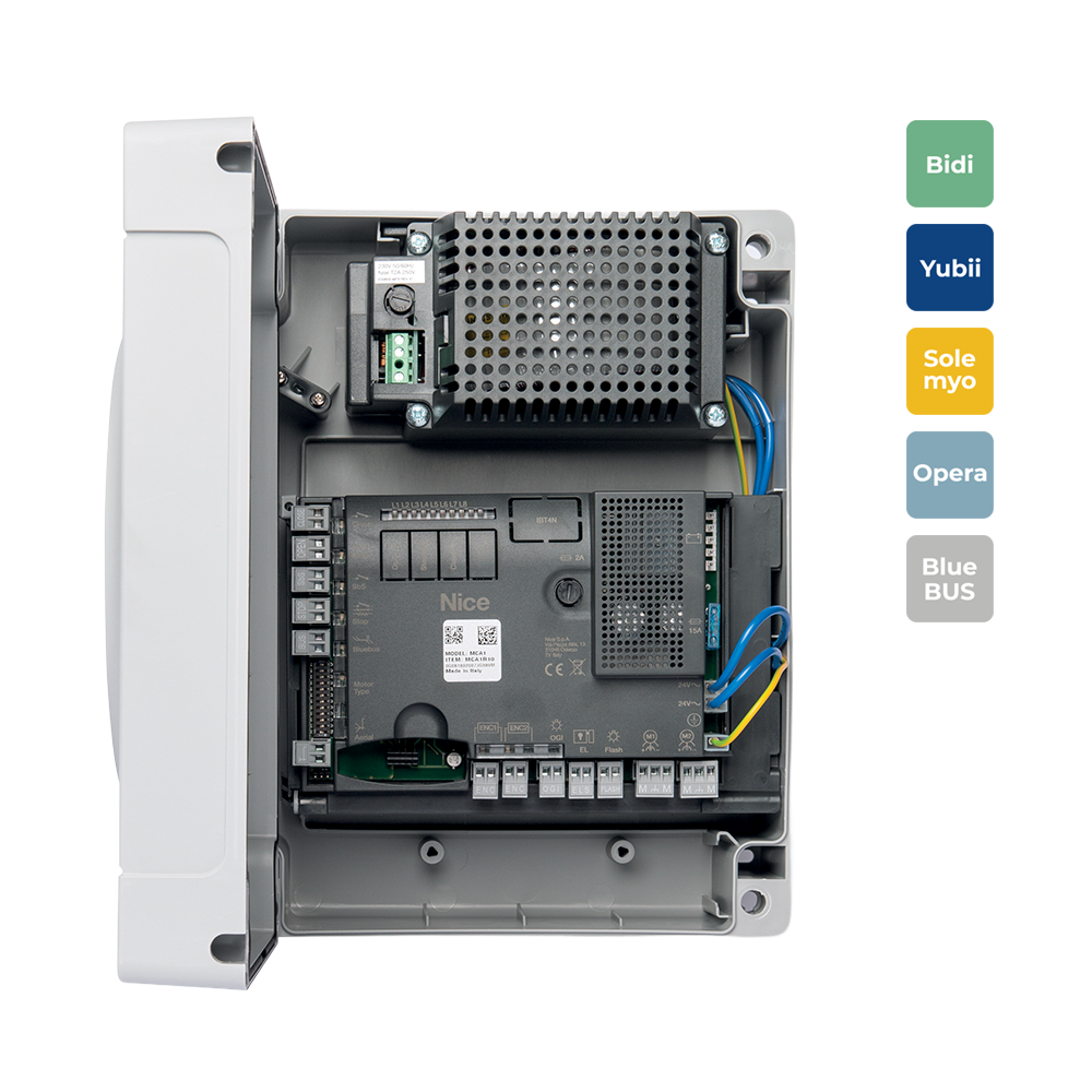 Vybavená technologií Nice BlueBUS, kompatibilní se systémem Opera pro ovládání, programování a diagnostiku pohonů i na dálku.