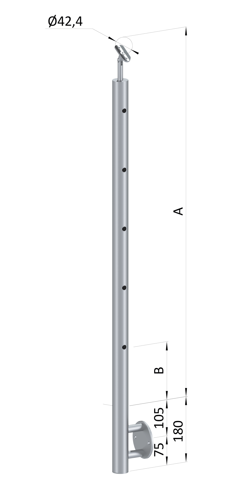 - Nerezový sloup, boční kotvení, 5děrový koncový, pravý Rozmer A