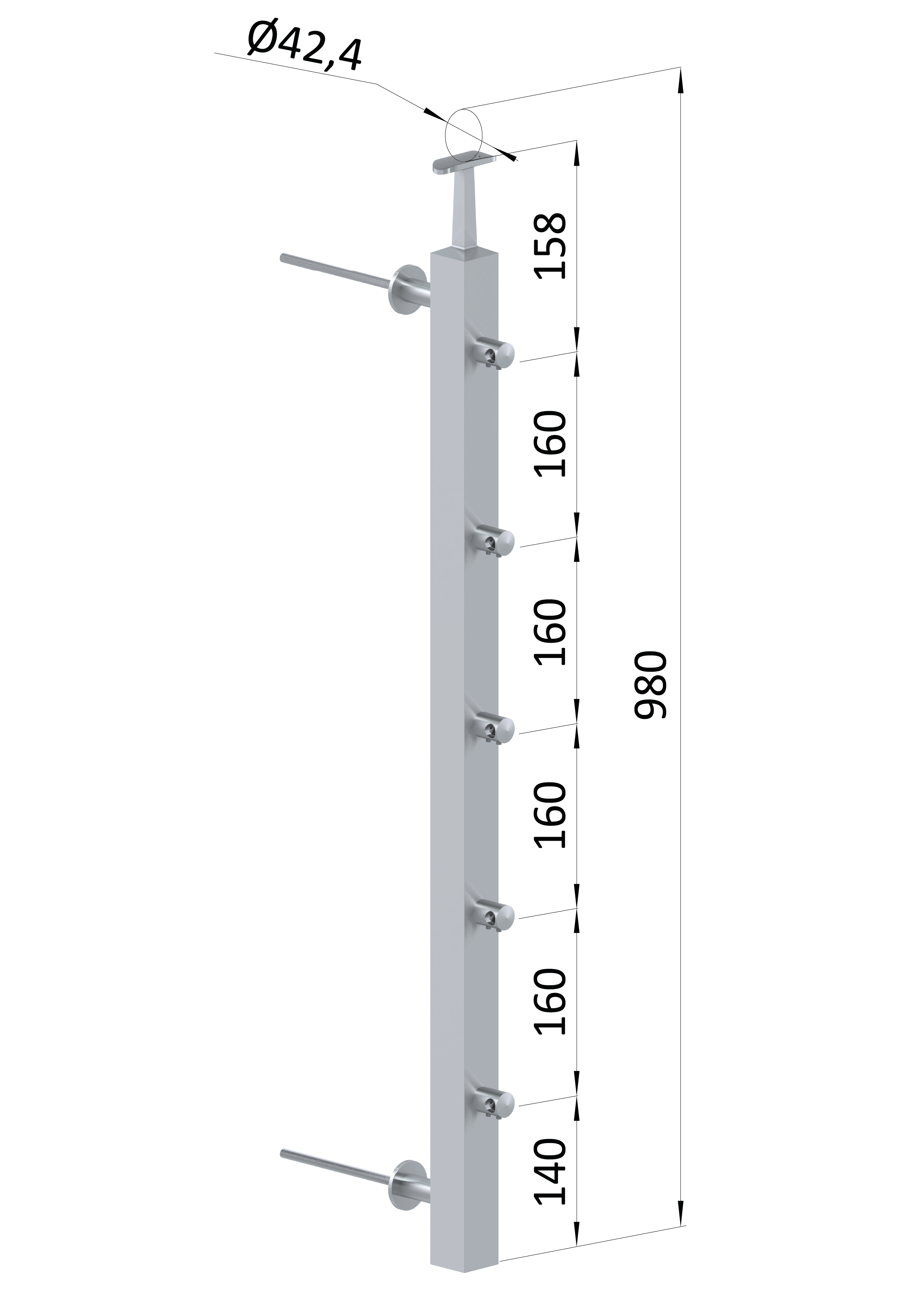 - Nerezový sloup na francouzský balkón, boční kotvení, 5 řadový, průchozí, vrch pevný, (40x40x2.0 mm), broušená nerez K320