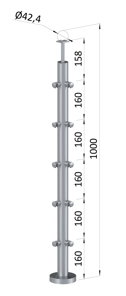Nerezový sloupø42,4x2mmvrchní kotvení5řadový, rohový: 90°vrch pevnýbroušená nerez K320 / AISI304 celý popis