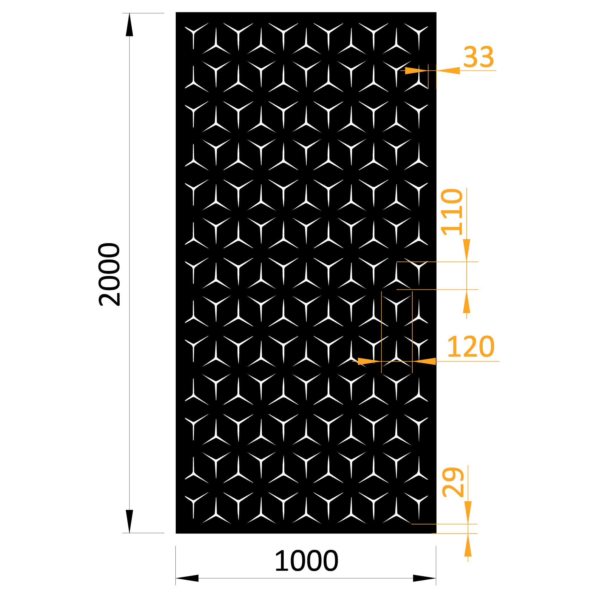 Designová kovová výplň, laserem vypálený vzor 9131, rozměr 1000x2000x2,0 mm +/- 0,5%. Šířka okrajů bez výpalu je 35mm.