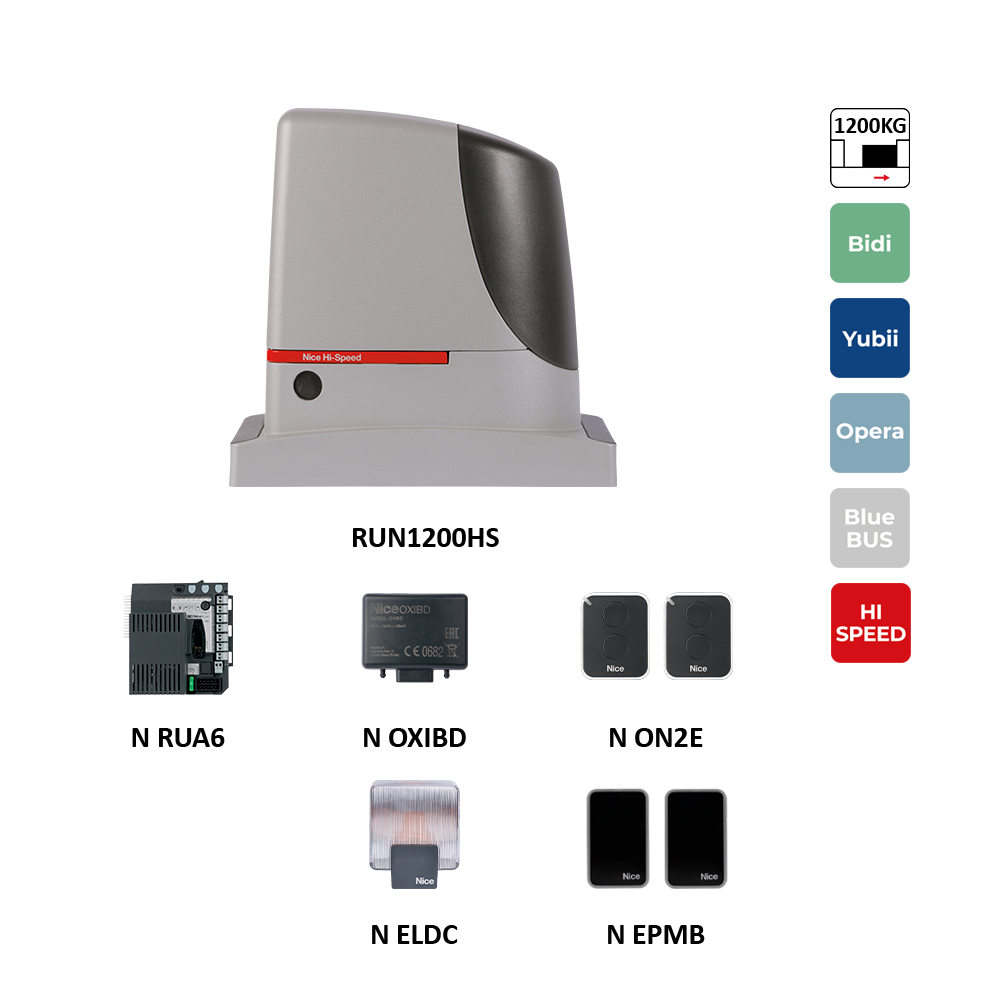 RUN1200 HI-SPEED kit rychlého pohonu pro posuvnou bránu do 1200 kg, 24 V, 700 W, BlueBus, 1x OXIBD, 1x EPMB, 1x ON2E, 1x ELDC, kompatibilní s nabíječkou baterií PS524 a akumulátory N B12-B (2 ks)