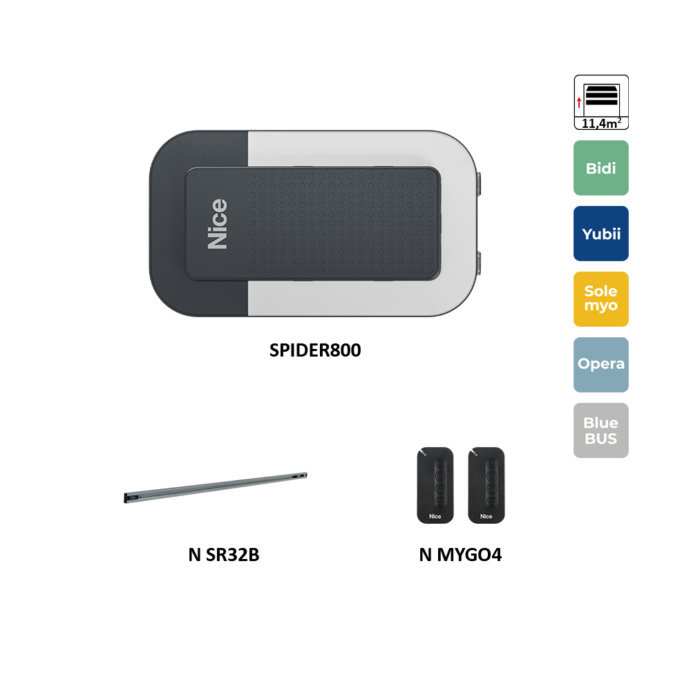 Nice Spider800 je nejnovějším řešením pro automatizaci garážových vrat, nabízející perfektní symbiózu výkonu, konektivity a designu. Tento motor je ideální pro sekční vrata až do 11,4 m².