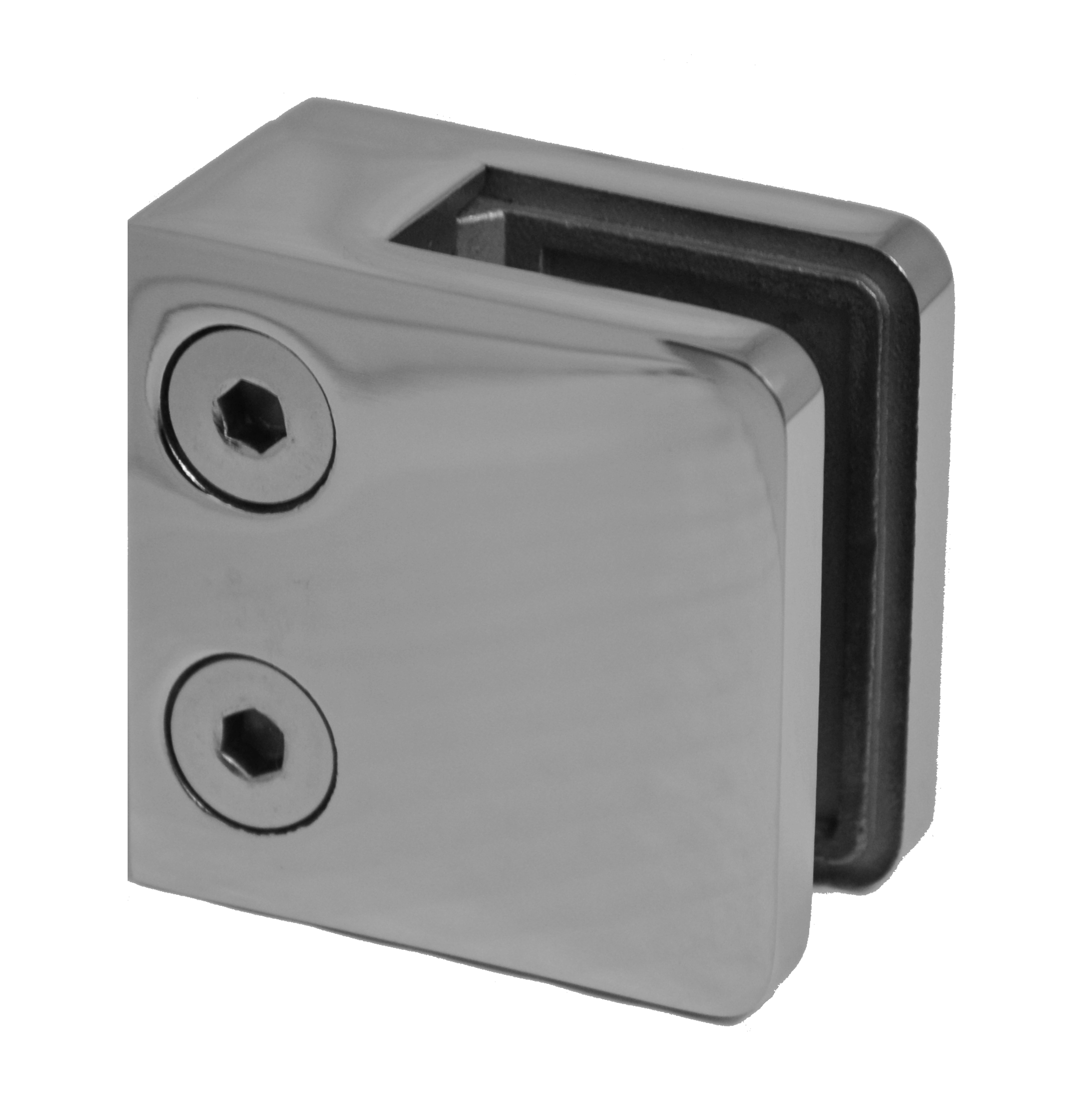 Svorka skla / plechu plochá (45x45x26 mm), bez úchytových šroubů a krytek na šrouby, leštěná nerez / AISI304, balení neobsahuje gumičky na sklo