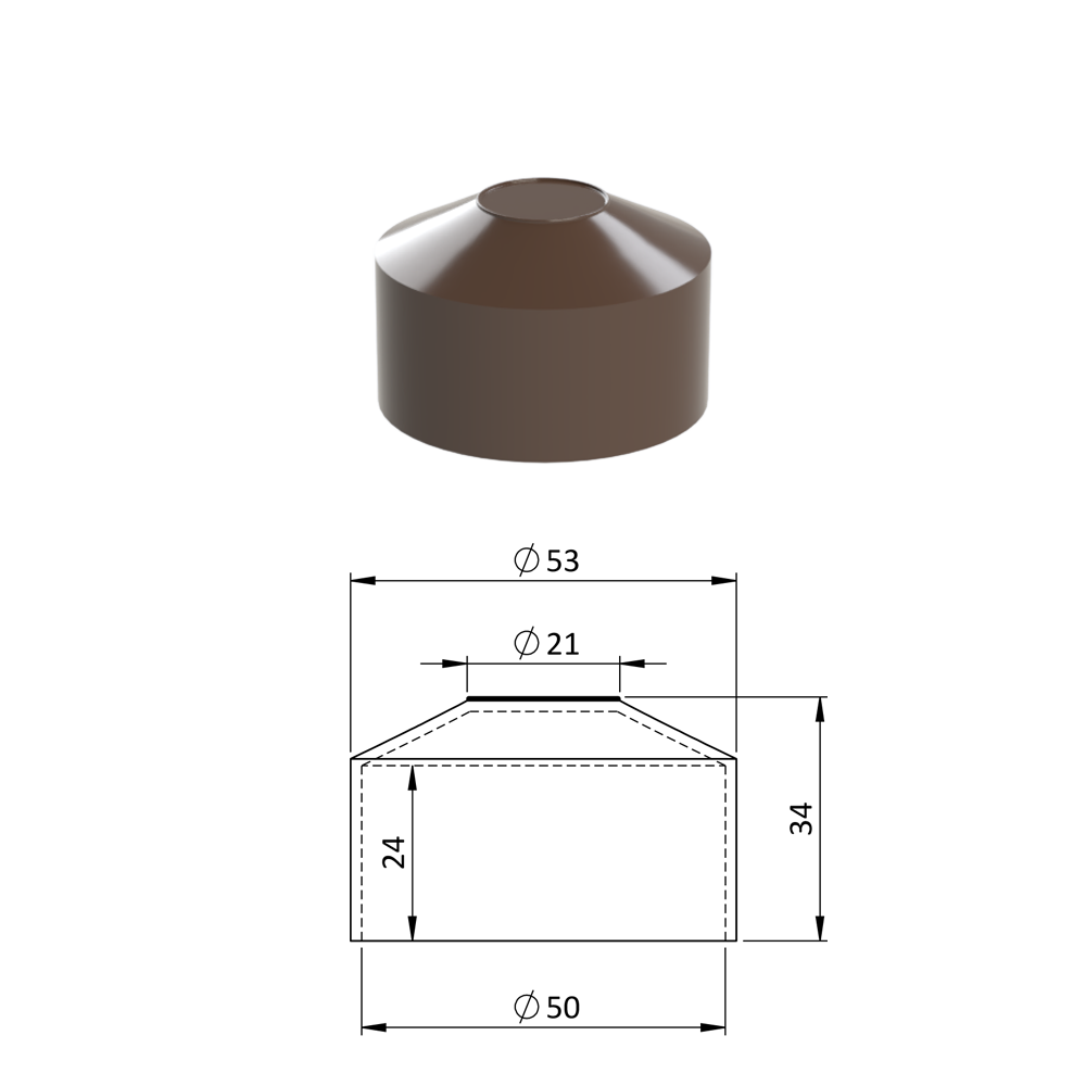 - Vnější krytka kulatá ø 48,3 mm, plastová PE, hnědá