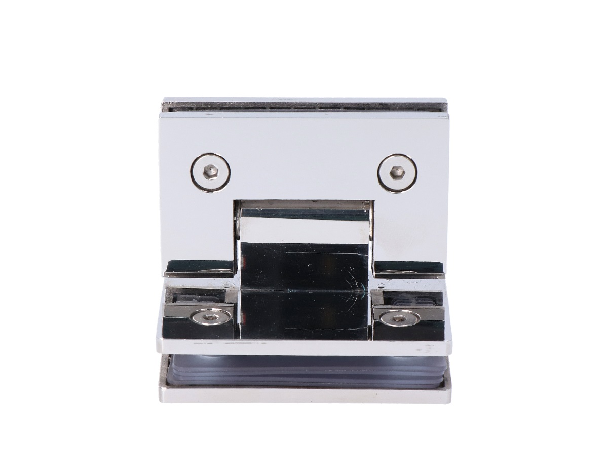 Závěs na skleněný dveřní systém, mezi sklo a sklo 90°, 90x80 mm, tloušťka skla 8-10 mm, leštěná nerez AISI304, samouzavírání +-15° a samozastavení +-90°-0°